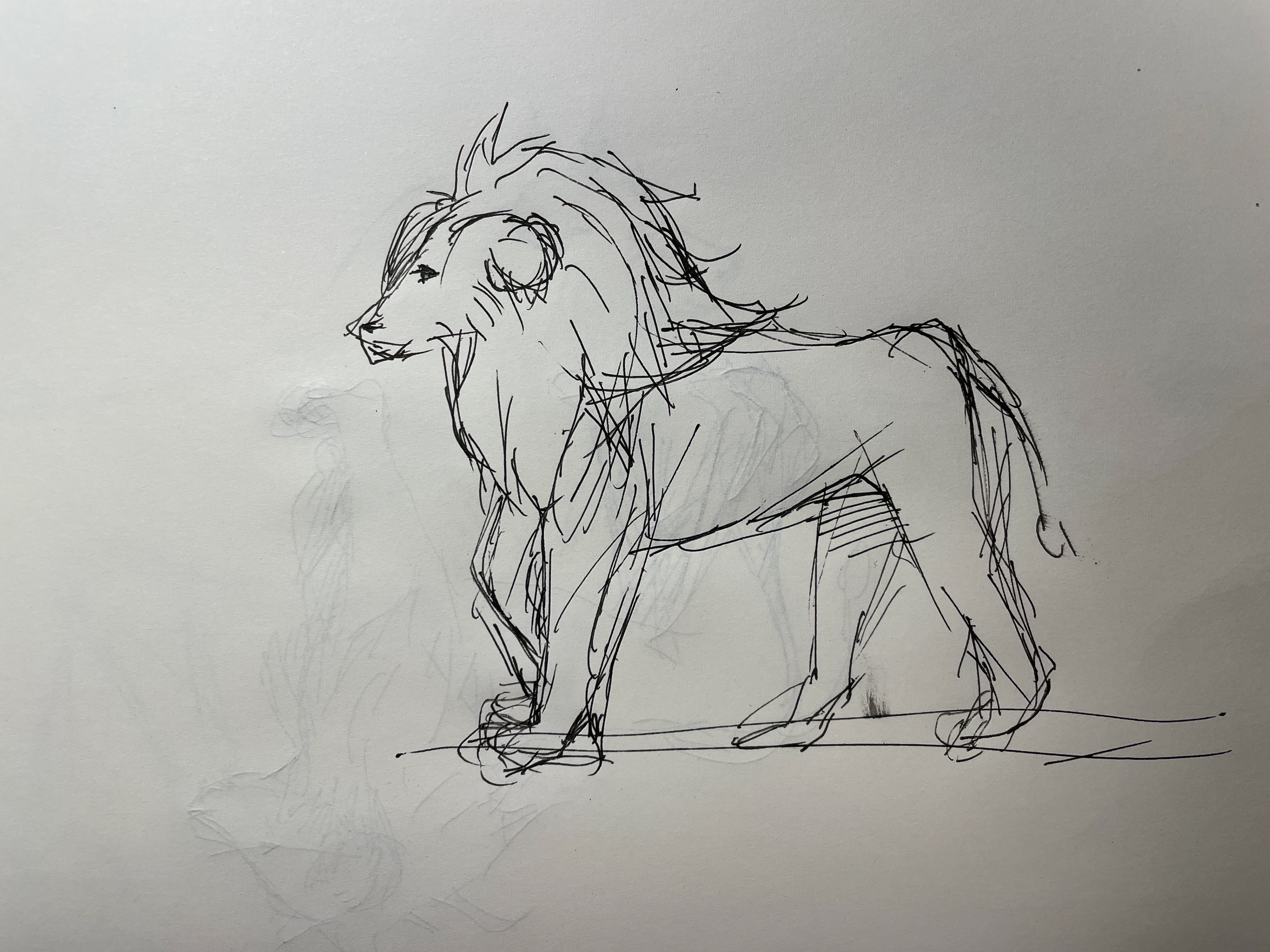この絵は自主制作のサンプルだったため、家族から感想をもらってライオンの体型を修正。